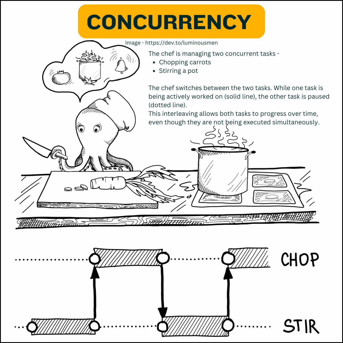 One chef is working on multiple dishes. While a pot is simmering, the chef chops vegetables for the next dish. Tasks overlap, but only one is actively running at a time.