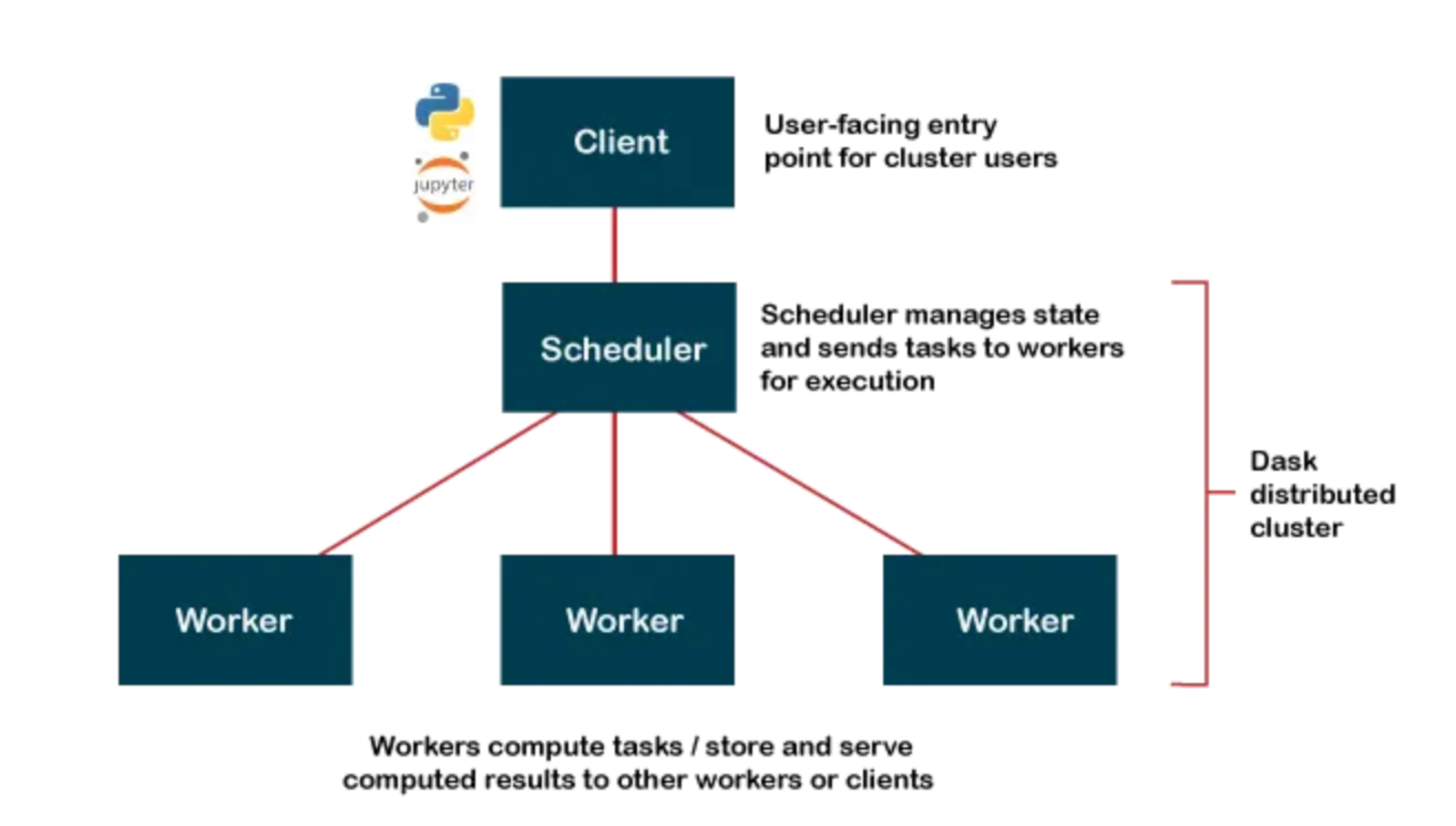 Distributed Compute: Dask executes tasks across multiple cores or machines, enabling scalable, parallel data processing.