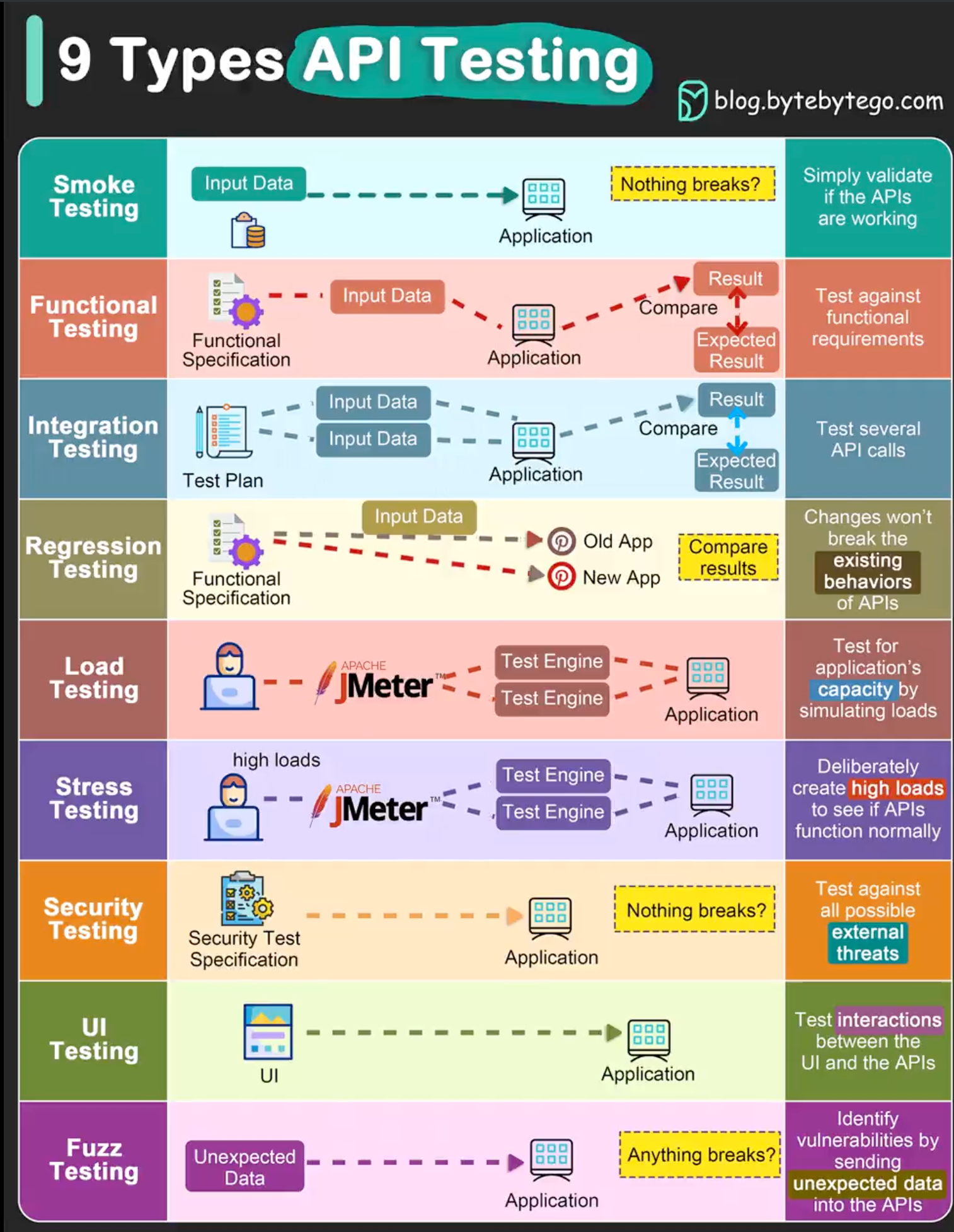 Regression Testing This test ensures that bug fixes or new features shouldn’t break the existing behaviors of APIs.